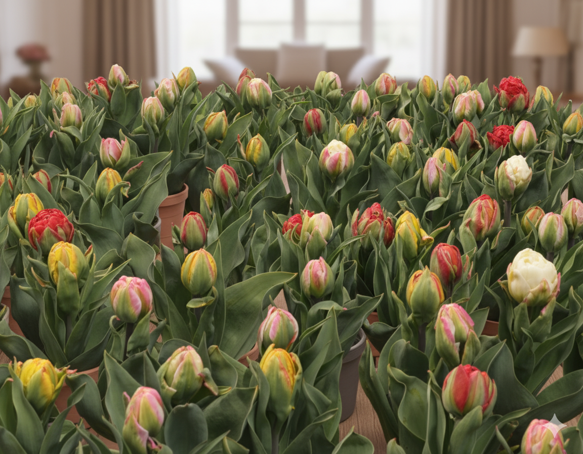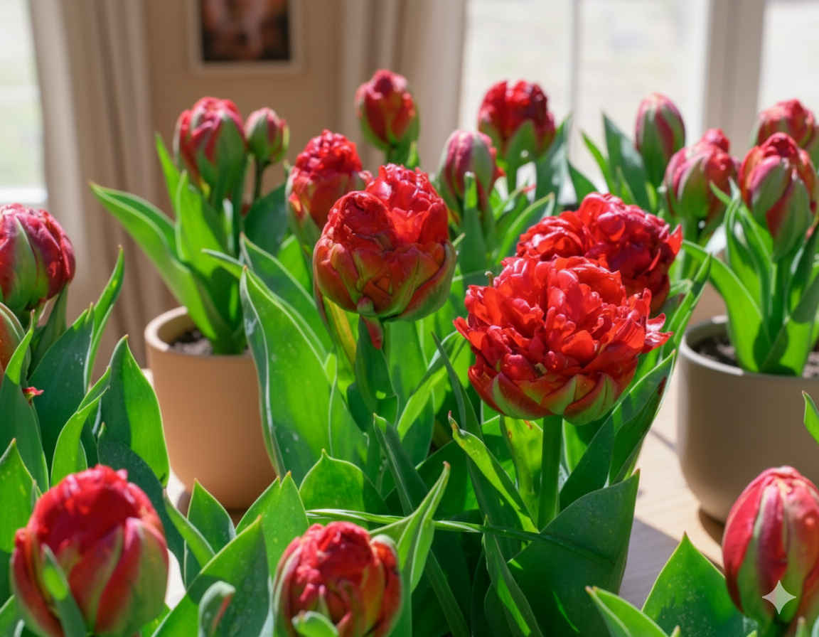 Для успішного вирощування тюльпанів «Ice Cream» у кімнатних умовах оберіть світле місце з м’яким, розсіяним освітленням.